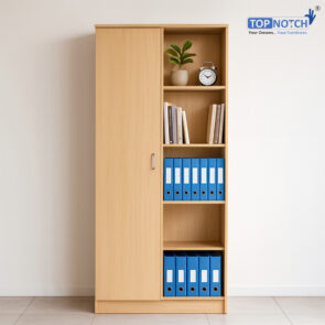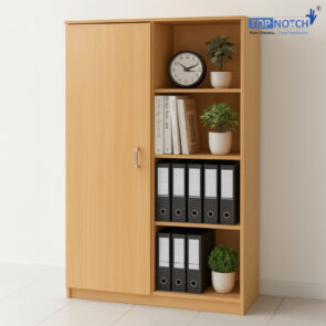 Topnotch Open Storage with Left Side Cupboard | 850W × 450D × 1580H mm | 3 Fixed Open Shelves + Swing Door Cupboard | Model: TNC-SS-PC-086 | Pre-Laminated Particle Board | SS Handle | Soft-Close Hinges