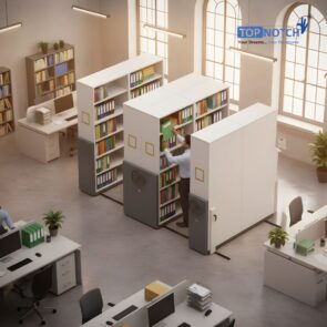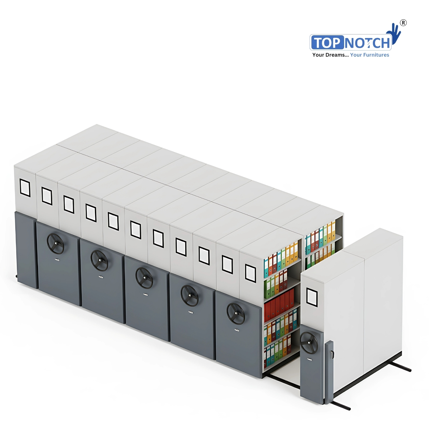 That translates to 1,400+ box files or 2,800+ thin office files, all organized within a space-efficient footprint. Unlike traditional racks or almirahs that consume space with multiple aisles, this system requires just one working aisle, saving up to 50–60% floor space.