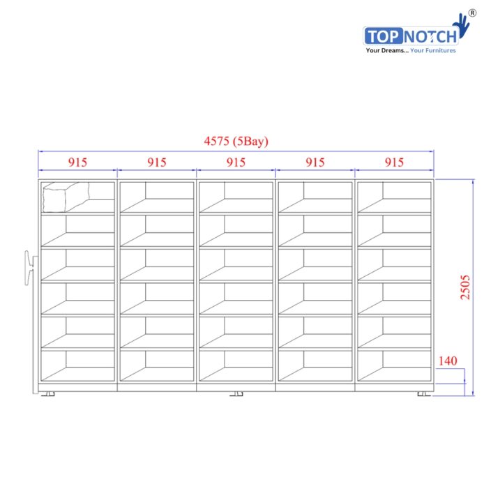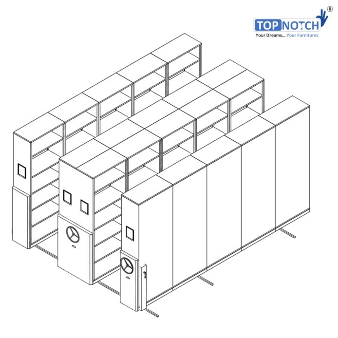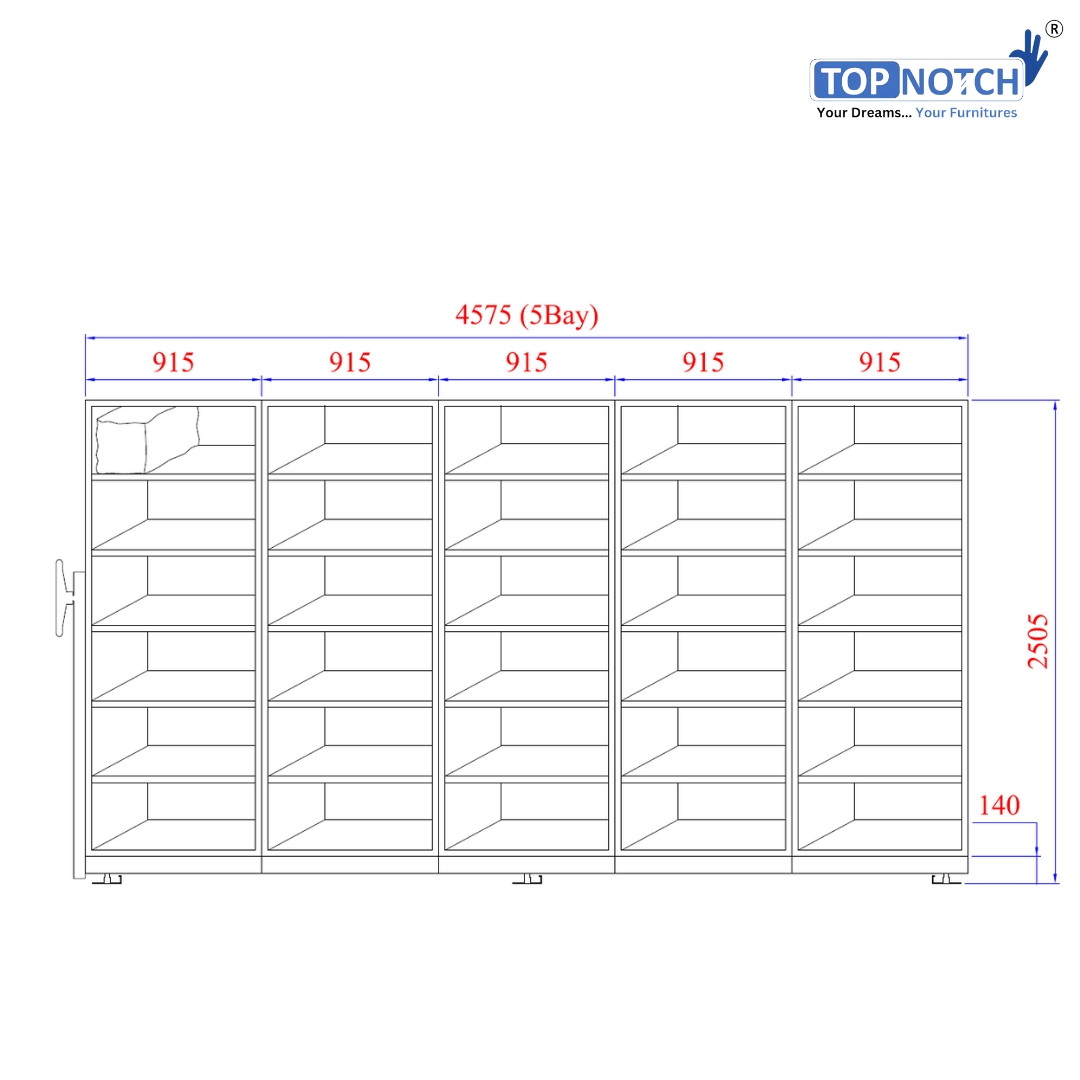The Topnotch 5 Bay – 20 Cabinets Mechanical Mobile Storage Compactor (Non-Standard, 2505 mm height) is a high-capacity, space-optimizing filing system designed for offices, banks, institutions, archives, and government departments that manage large volumes of records.