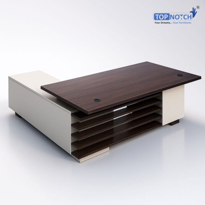 Premium L-shape executive table with 3-drawer pedestal, dual color finish, side storage cabinet, knock-down design, and wire managers. Made by Topnotch in Jaipur.