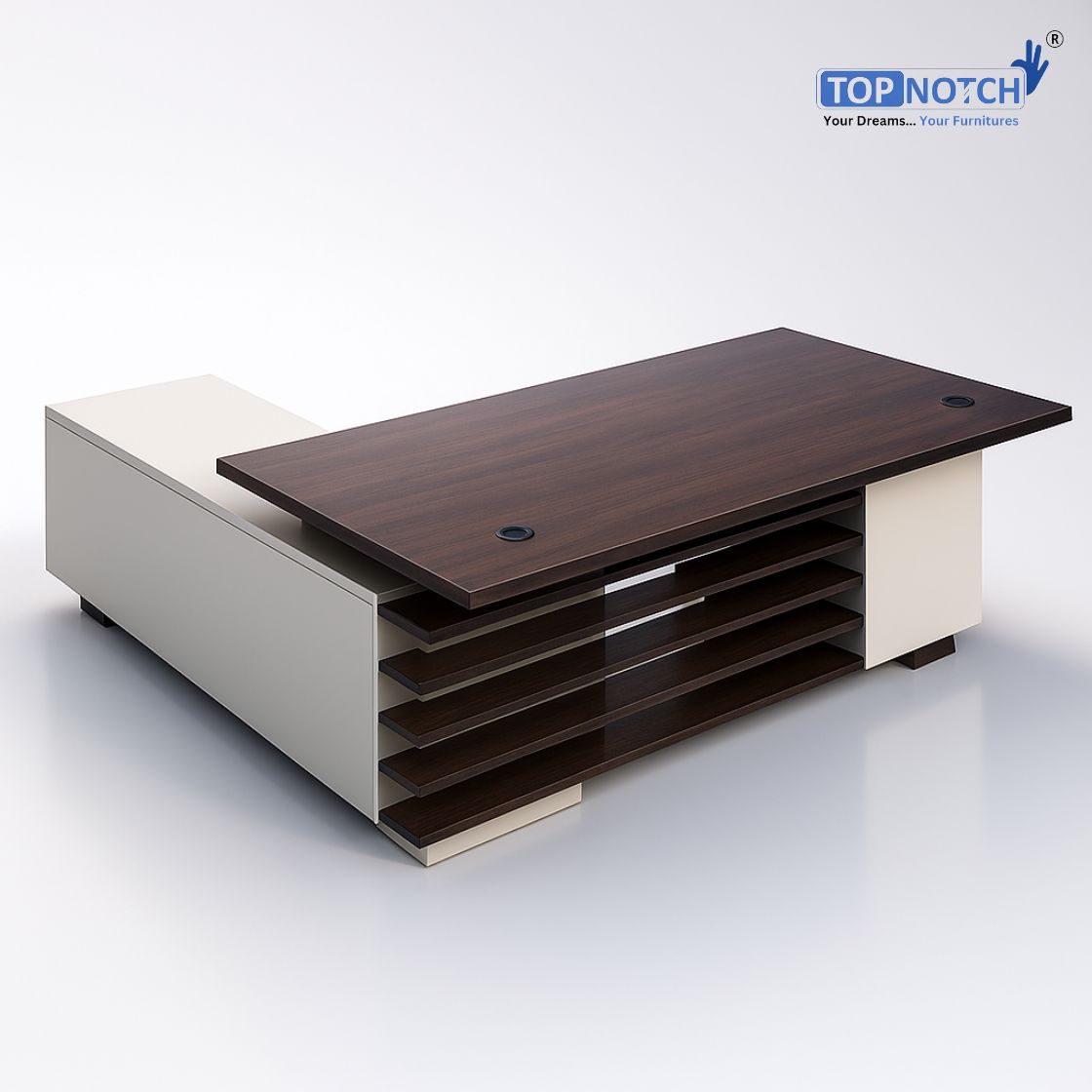 A premium L-shape modular executive table from Topnotch, crafted for modern workspaces. Built with dual-color finish, fixed pedestal, and smart cable management, it ensures utility, elegance, and easy mobility with its knock-down design.