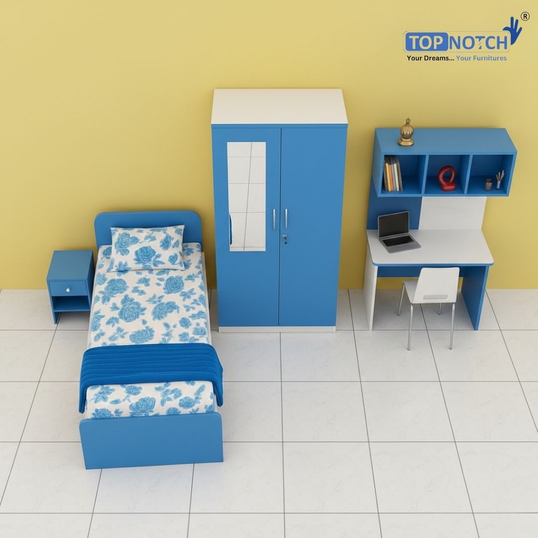TopNotch Hostel Furniture Set is a complete, space-efficient, and durable student room setup designed for institutional use. Each unit includes a single bed, a study table, a bedside table, and a wooden wardrobe with glass door – offering comfort, storage, and aesthetics ideal for modern hostel rooms.