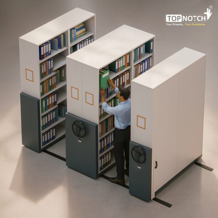 TopNotch Mobile Storage Compactor (2 Bay – 8 Body) is a robust mechanical filing solution designed for high-density storage in offices, hospitals, universities, and institutions. Made from prime CRCA steel, its knockdown construction with weldless joints ensures long-term durability and flexibility.