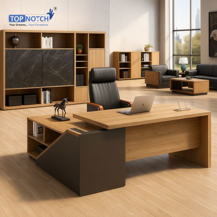 Crafted from high-quality pre-laminated particle board with 2mm PVC edge banding, the table is scratch-resistant, easy to maintain, and long-lasting. The modular design allows customization with side return units, under-desk storage, or pedestal drawers, giving executives ample space to store files, stationery, and personal items securely.