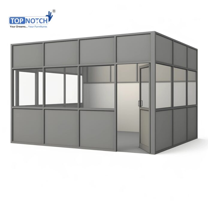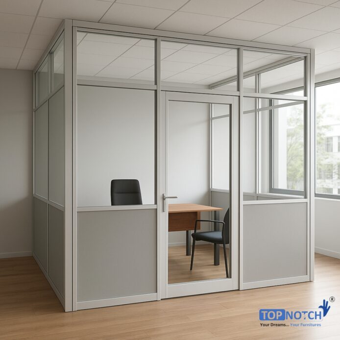 An aluminium partition is a modular interior wall system made from aluminium frames, particle board, and glass panels. It is used to divide large spaces into cabins, workstations, or conference areas without permanent construction. Unlike brick walls, aluminium partitions are lightweight, relocatable, cost-effective, and modern-looking, making them ideal for offices, banks, schools, colleges, hospitals, showrooms, and corporate workspaces.