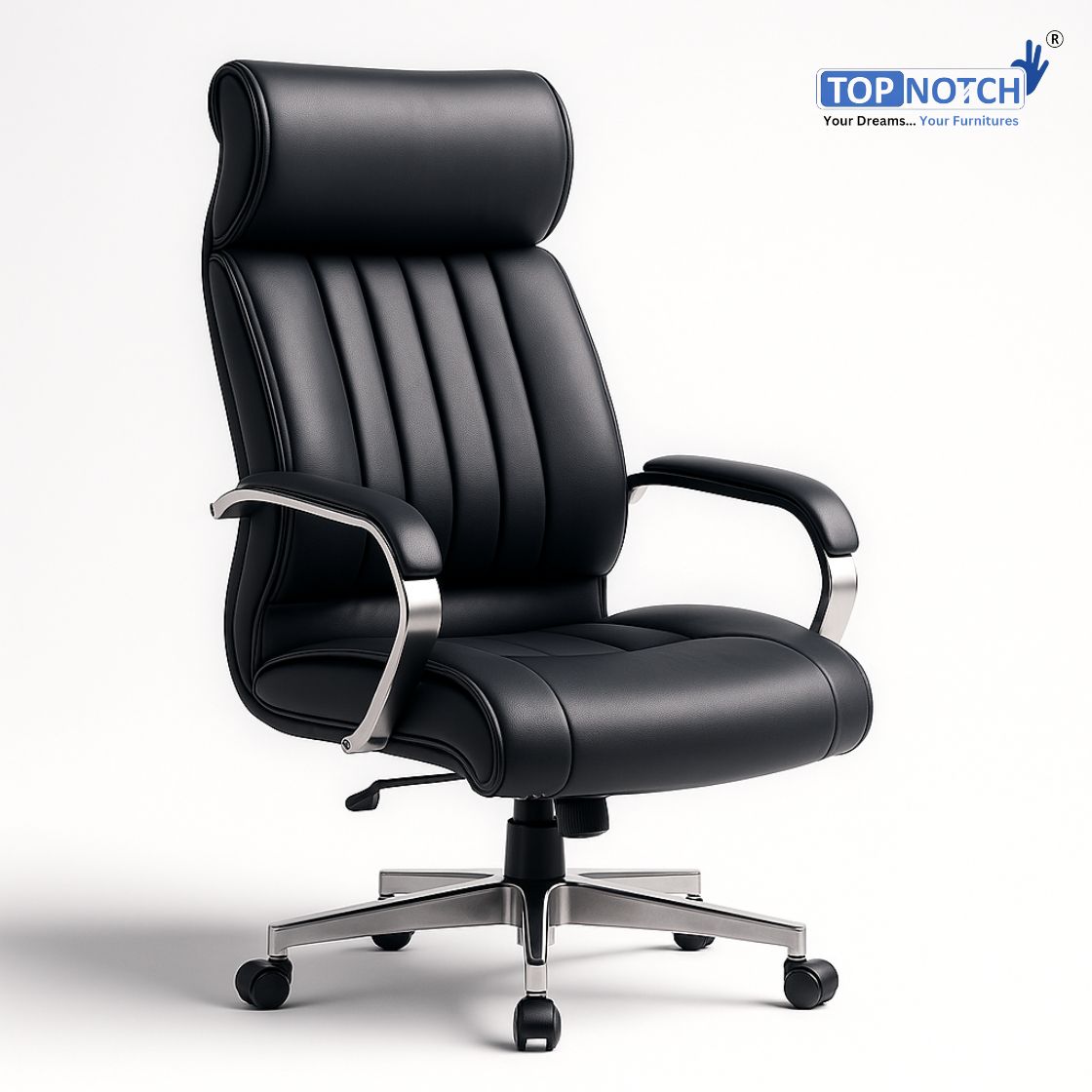Topnotch’s Marlos-01 High Back Chair blends executive style with ergonomic comfort. Featuring premium leatherite upholstery, center tilt mechanism, fixed cushioned armrests, and durable dual wheels, it’s designed for leadership cabins, corporate offices, and home offices alike.