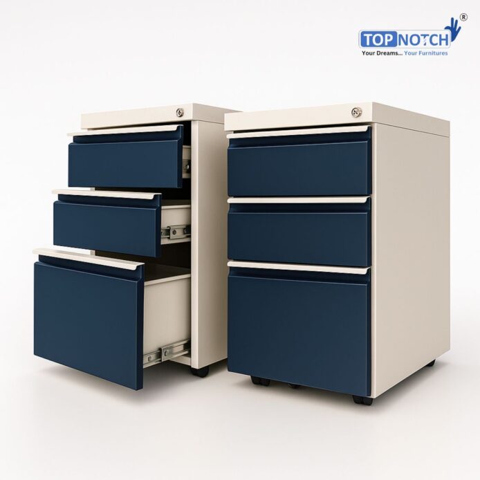 Topnotch mobile pedestal with 3 drawers, 0.8mm CRCA steel, central locking, and powder-coated finish. Compact, durable, and ideal for under-desk office use. Made in Jaipur.