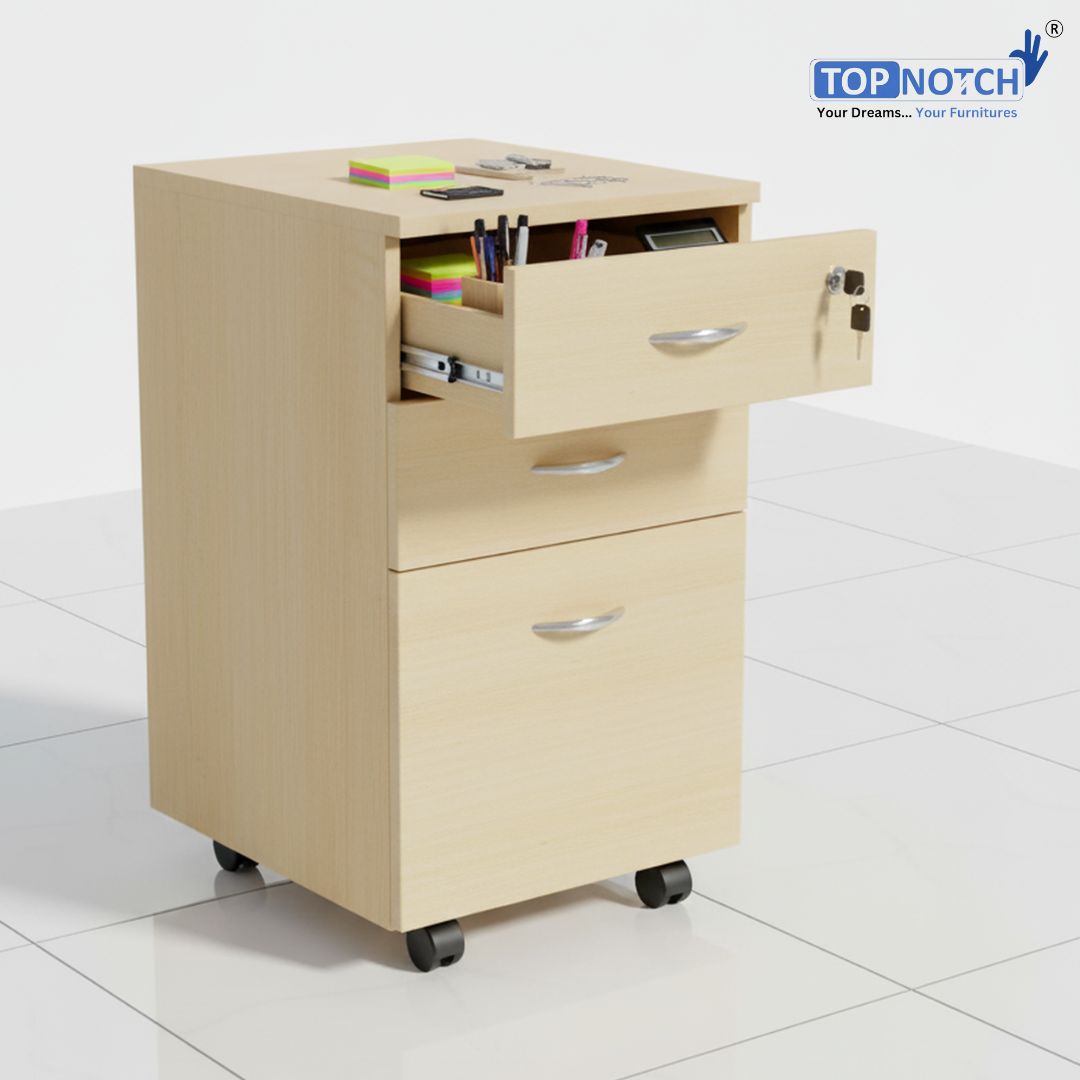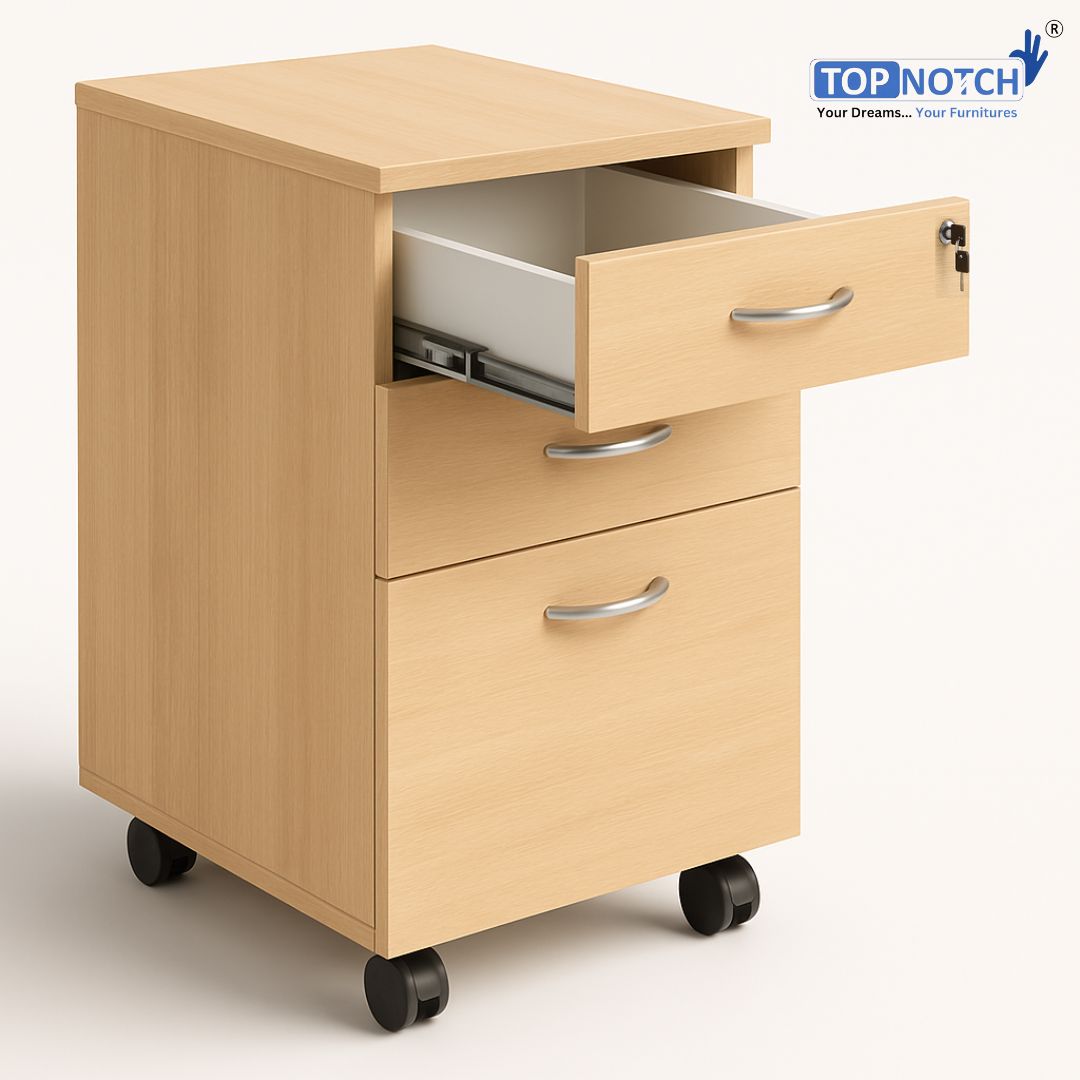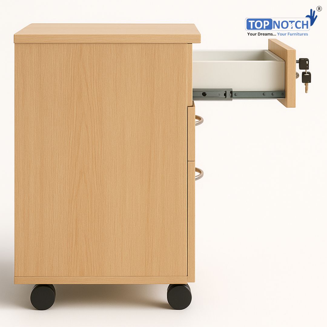 The Topnotch Mobile 3-Drawer Pedestal is a compact yet highly functional storage unit designed to provide security, mobility, and durability for modern workspaces. Perfect for corporate offices, study rooms, educational institutions, hospitals, banks, and home offices, this pedestal helps you organize files, stationery, and personal items efficiently.