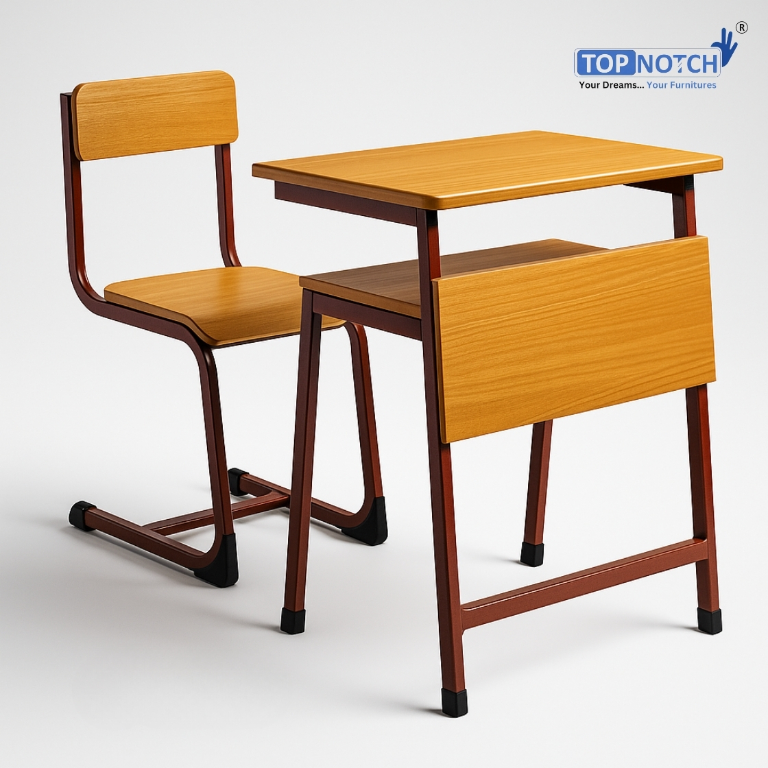 Upgrade any learning or work environment with the Topnotch Premium Desk & Chair Set – a perfect blend of durability, comfort, and aesthetic appeal. Crafted with a sturdy mild-steel frame finished in scratch-resistant matte maroon powder coating, and paired with a warm light oak wooden surface, this set is ideal for schools, training centers, home study rooms, and coaching institutes.