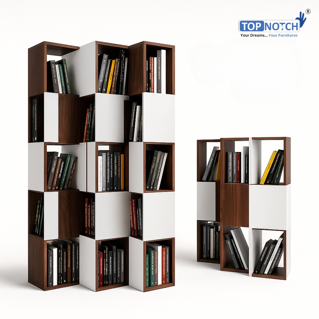 The TopNotch Diagonal Bookshelf brings a modern twist to traditional library shelving. With its angled, open-type compartments, this design allows for visually striking book displays while keeping items easily accessible. Built from 18mm pre-laminated particle board (PLPB) with 2mm PVC edge banding, the unit offers a perfect combination of style and durability.