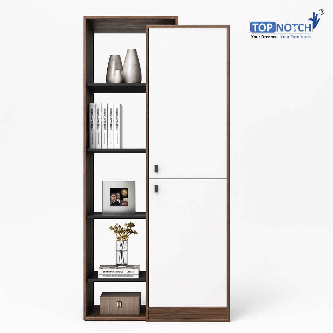 The TopNotch Display cum Storage Cabinet is the perfect blend of style and functionality, offering both open display shelves and closed storage compartments. Featuring 2 openable shutters with a fixed shelf inside each, plus 4 open shelves with 5 compartments, it’s ideal for books, decor, trophies, or everyday essentials.