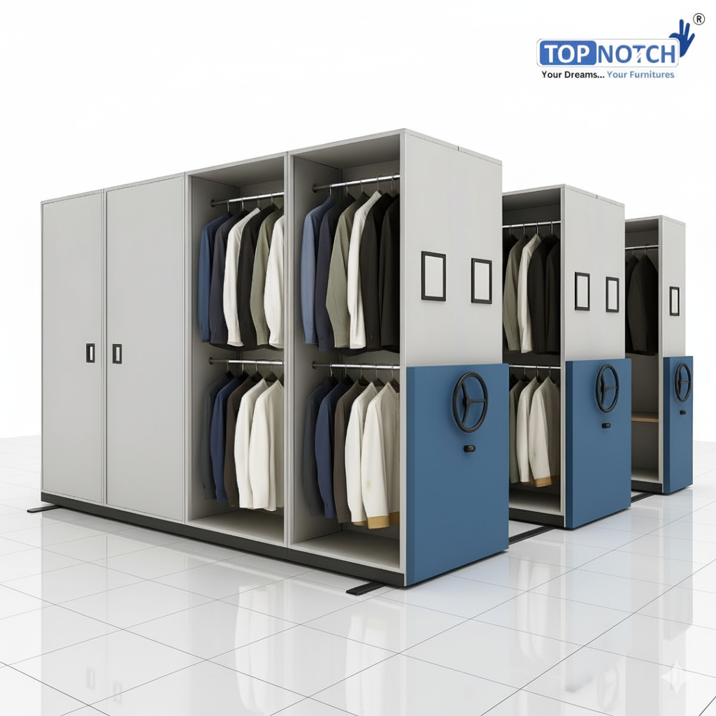 TopNotch introduces the first-of-its-kind Mobile Storage Compactor with Clothes Hanger, designed to combine filing system efficiency with garment storage solutions. Whether in hospitals, defense units, police stations, hotels, or corporate offices, this compactor ensures organized, space-saving, and secure storage of uniforms, coats, gowns, and garments alongside documents.