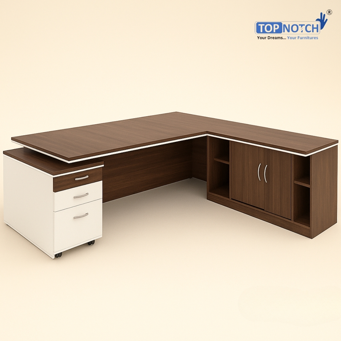 Buy Topnotch modular L-shape office table with dual color top, 3-drawer pedestal, central locking, double-side storage, knock-down design & DIY installation. Pan-India delivery.