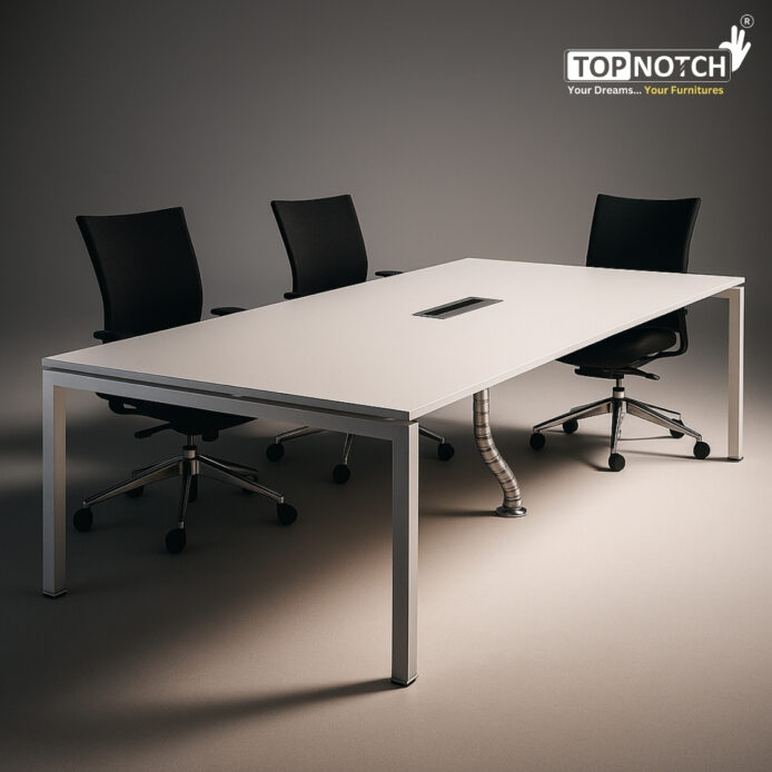 Buy the Topnotch Premium Office Table with matte white laminated top, heavy-duty steel frame, and integrated cable management. Ideal for offices, conference rooms, and co-working spaces. Pan-India delivery.