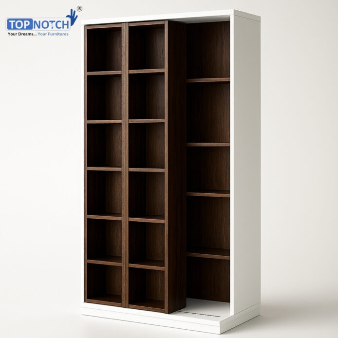 Buy Topnotch sliding wooden bookshelves with 3 lateral racks and 12 compartments per rack. Space-saving wall-side fixed design, 18mm PLPB with PVC edge banding, dual-tone finish, customizable, pan-India delivery.