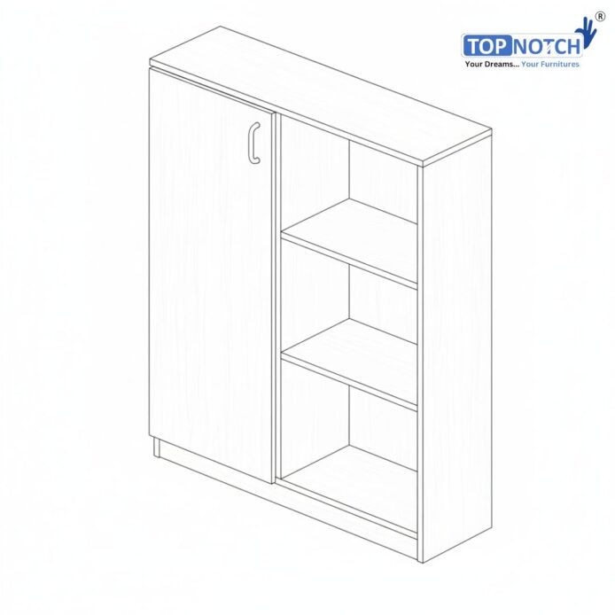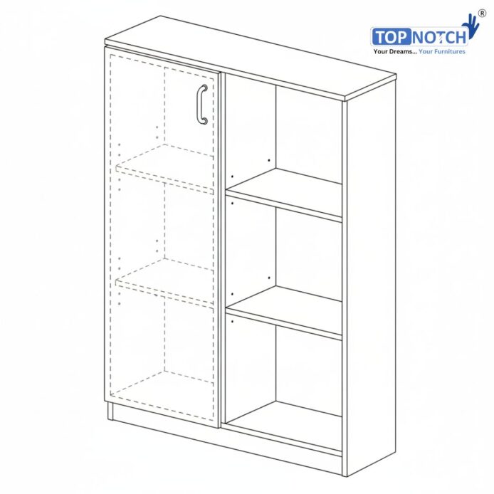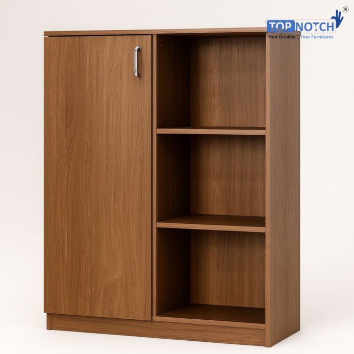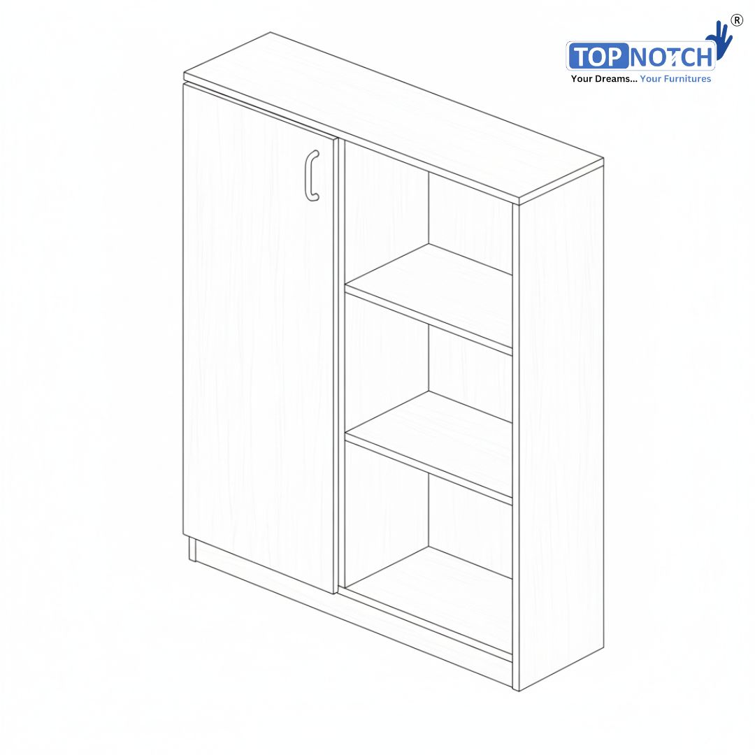 The Topnotch Wooden Bookshelf with 1 Shutter Swing Door is a versatile storage solution designed for both professional offices and modern homes. With its compact size (850 mm width × 450 mm depth × 1350 mm height), it provides maximum storage capacity in minimum floor space while combining open and closed compartments for dual usage.